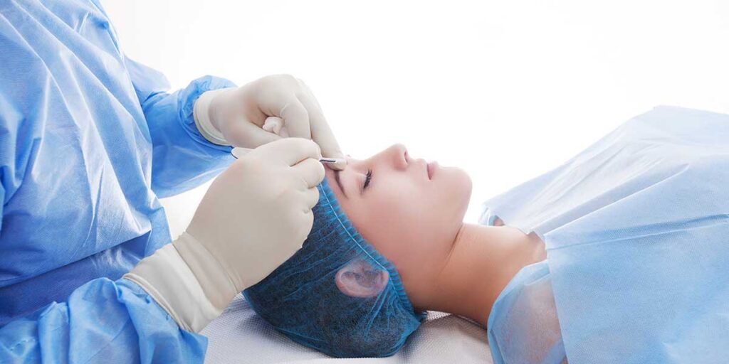 Skin is disinfected and blue wraps are placed to protect the eye area from external environment.